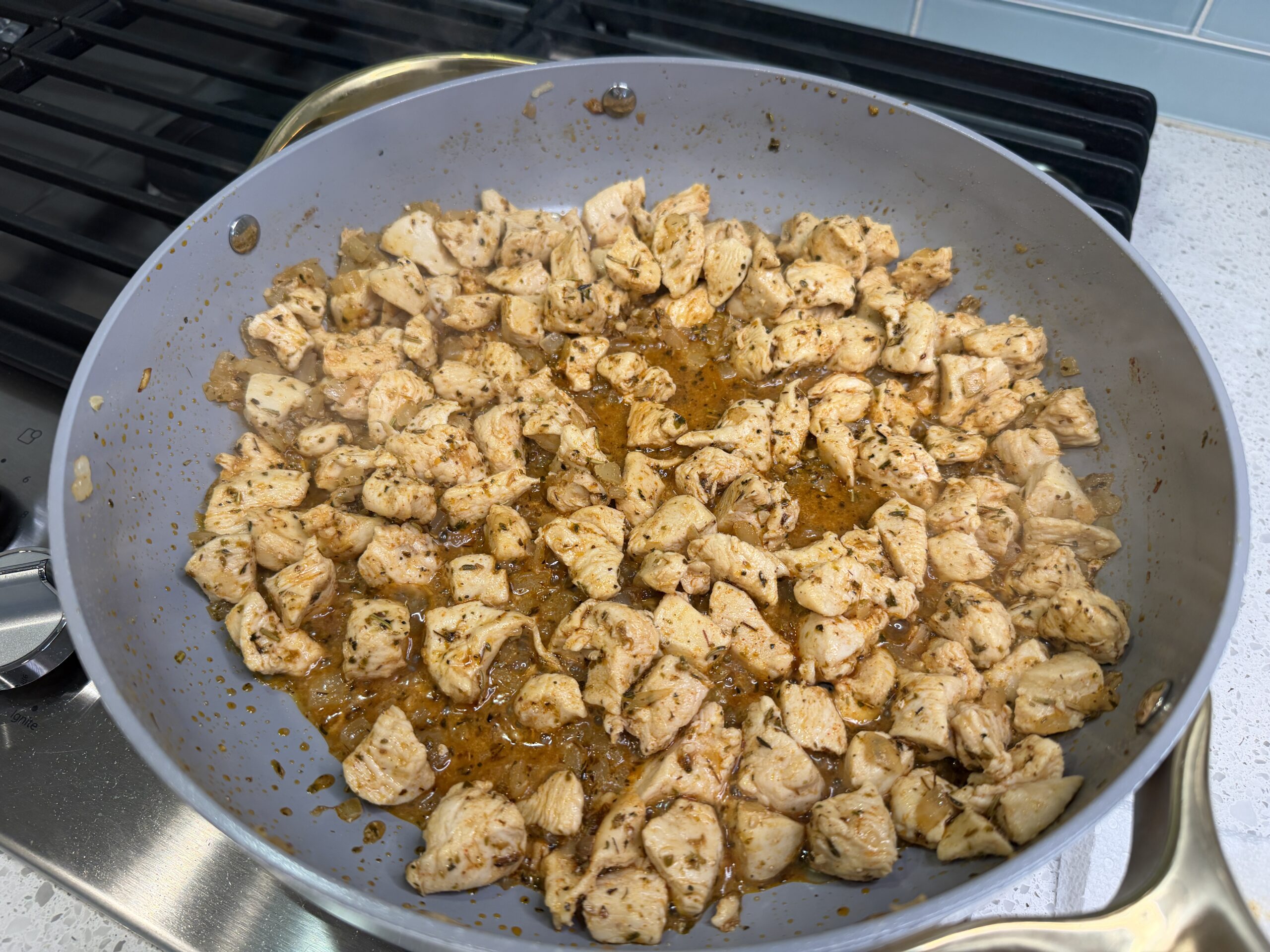 - Heat the olive oil in a large skillet over medium heat. Add the onion and garlic and cook until soft. Add the diced chicken and cook until browned. Stir in the salt, paprika, and Italian seasoning. Continue cooking until chicken is cooked through.