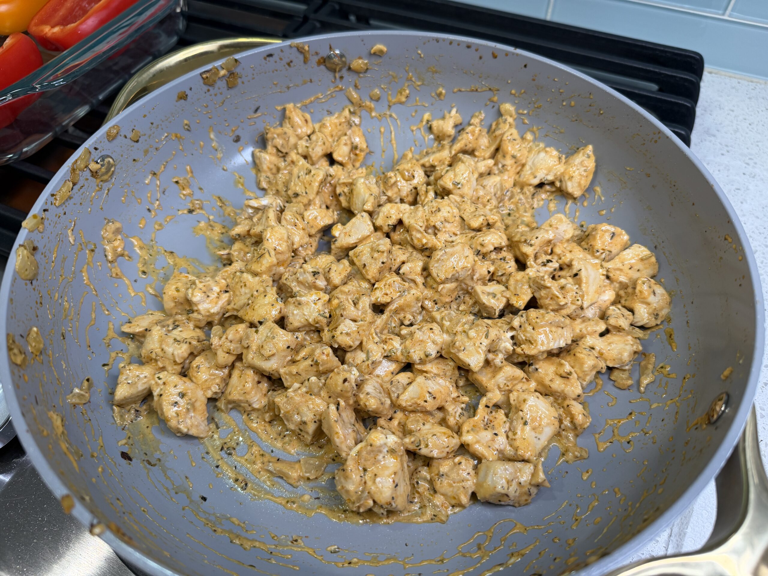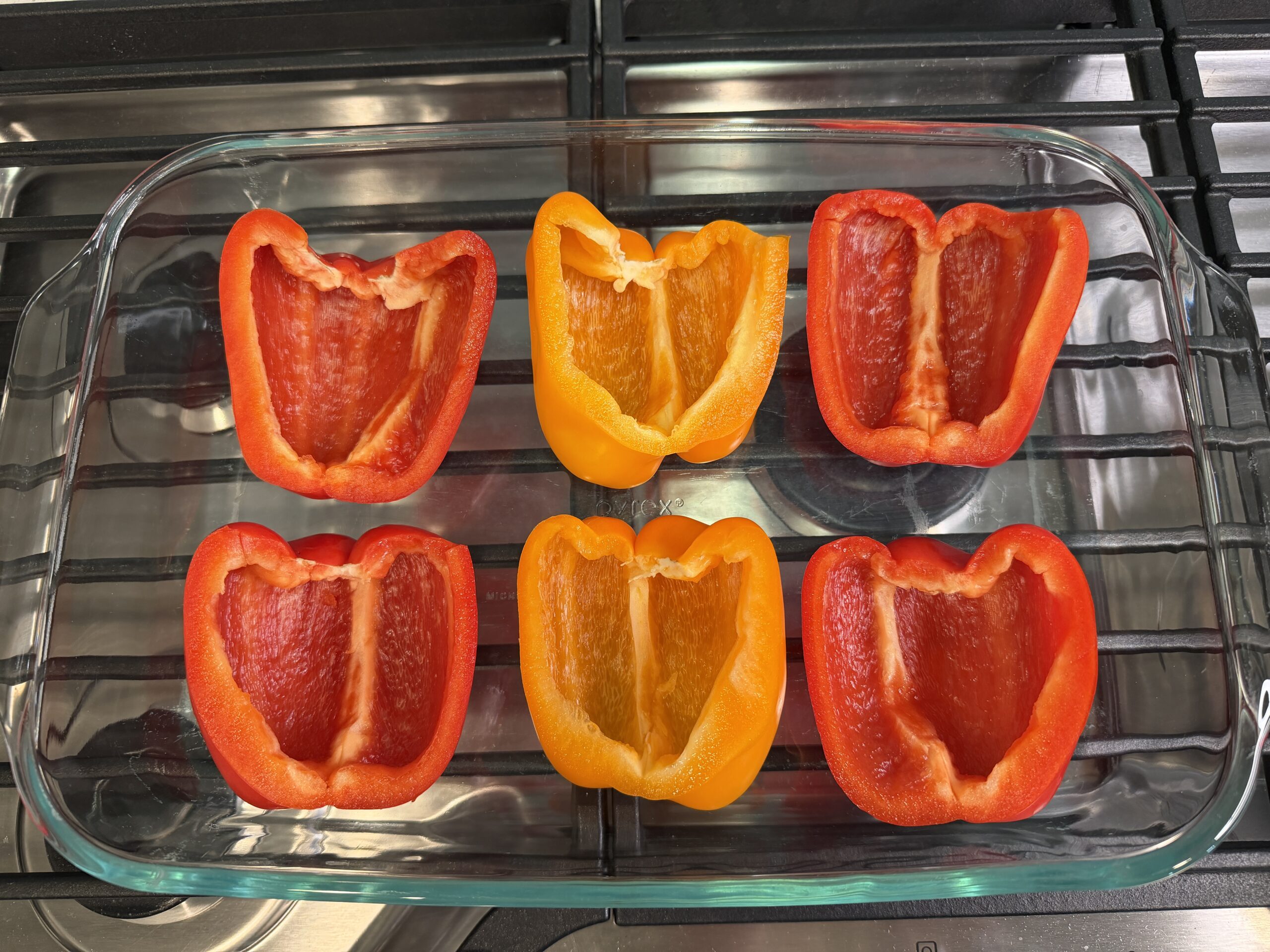 Step 3: While the chicken is cooking, cut the bell peppers in half and remove the core and seeds. Place in a large baking dish face up.