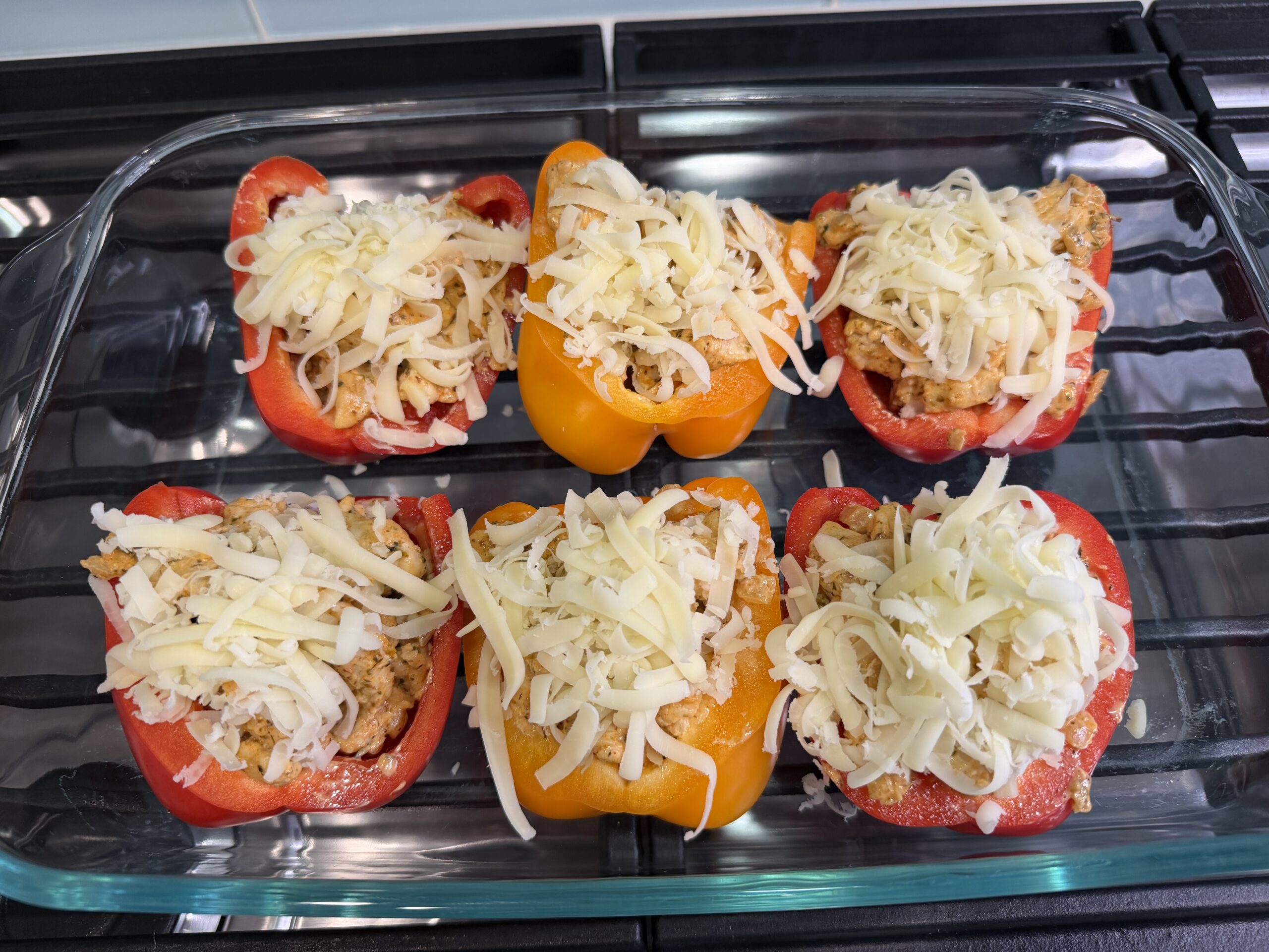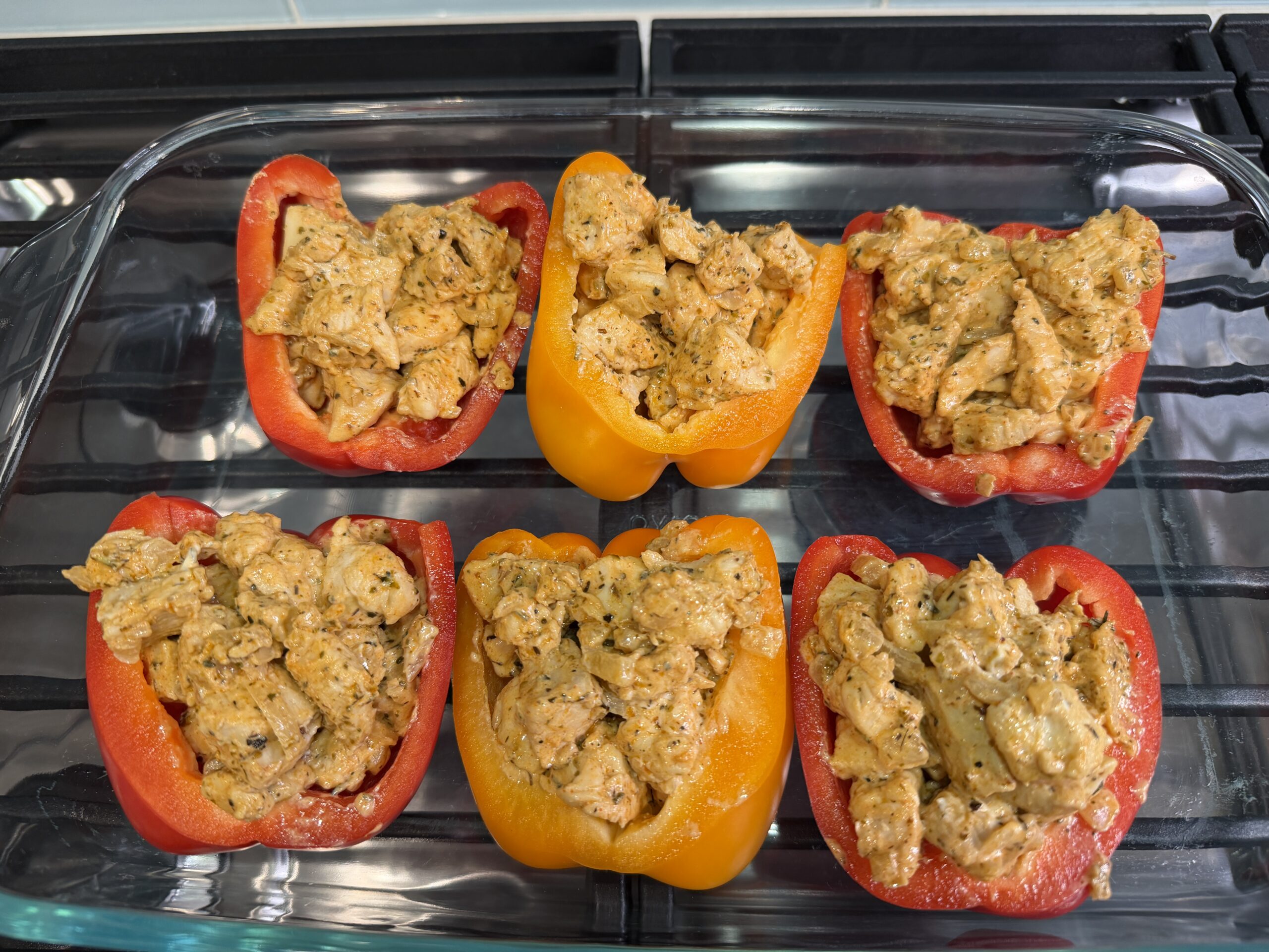 - While the chicken is cooking, cut the bell peppers in half and remove the core and seeds. Place in a large baking dish face up.