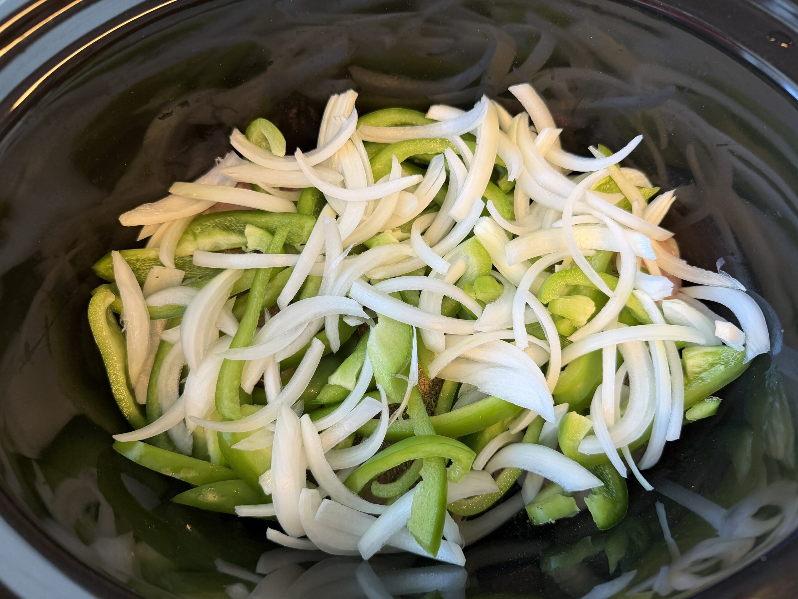 Step 2: Top with sliced onions and peppers. Cover and cook for 6 hours on low or ~3-4 hours on high.