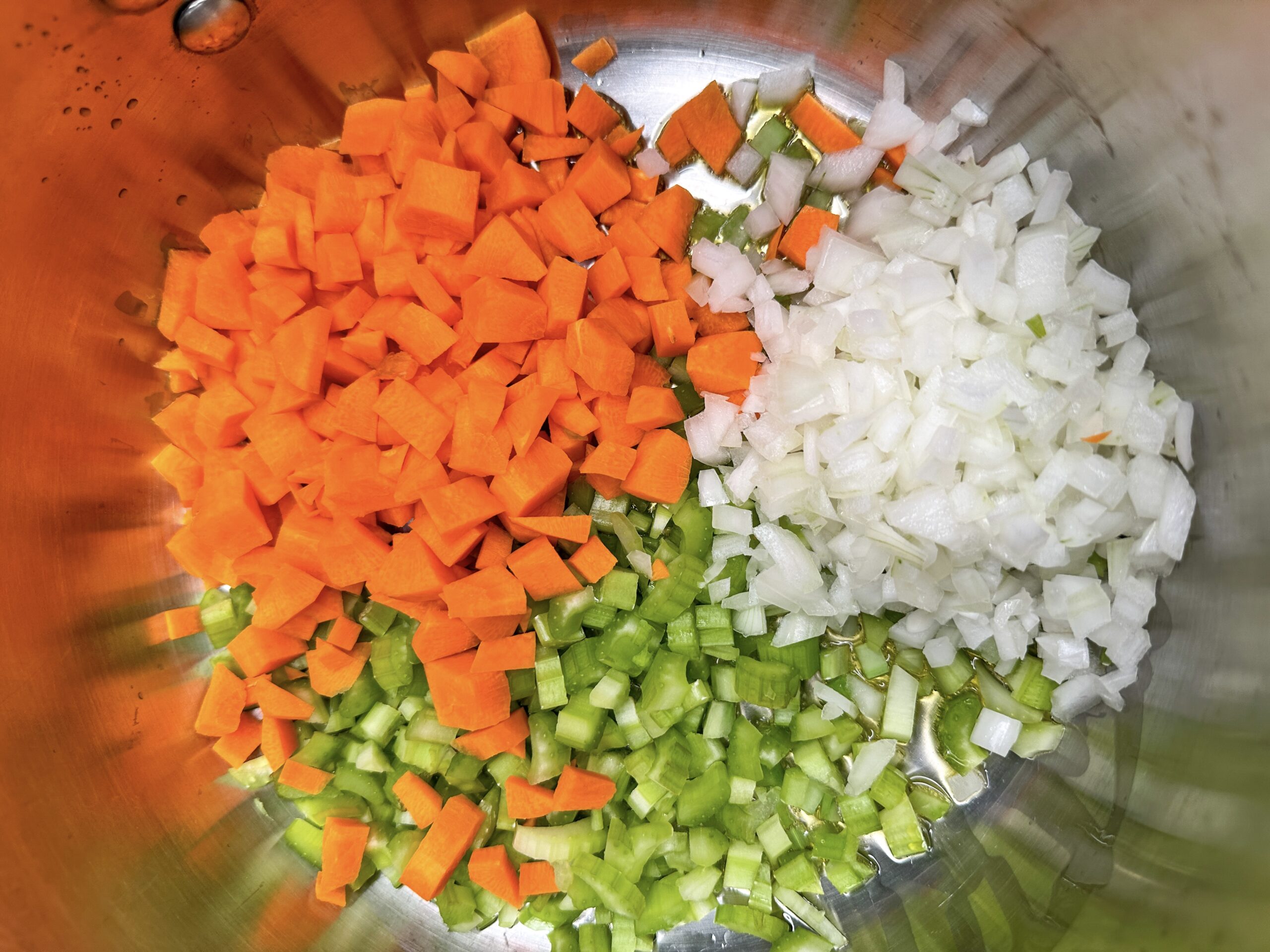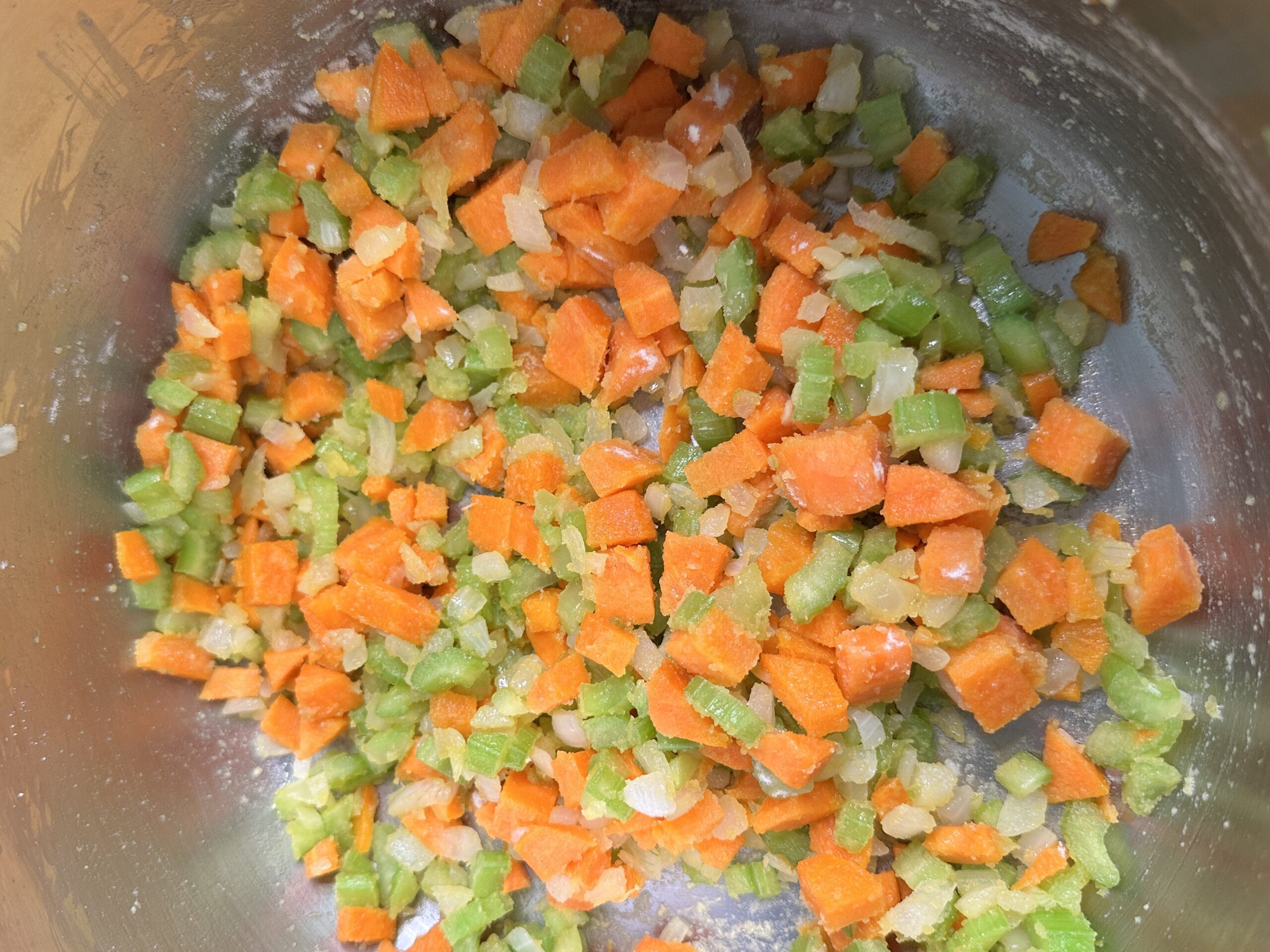 Step 1: Once the butter and oil are warm and melted, add the chopped celery, carrots, and onions and cook for about 5-7 minutes, stirring occasionally.