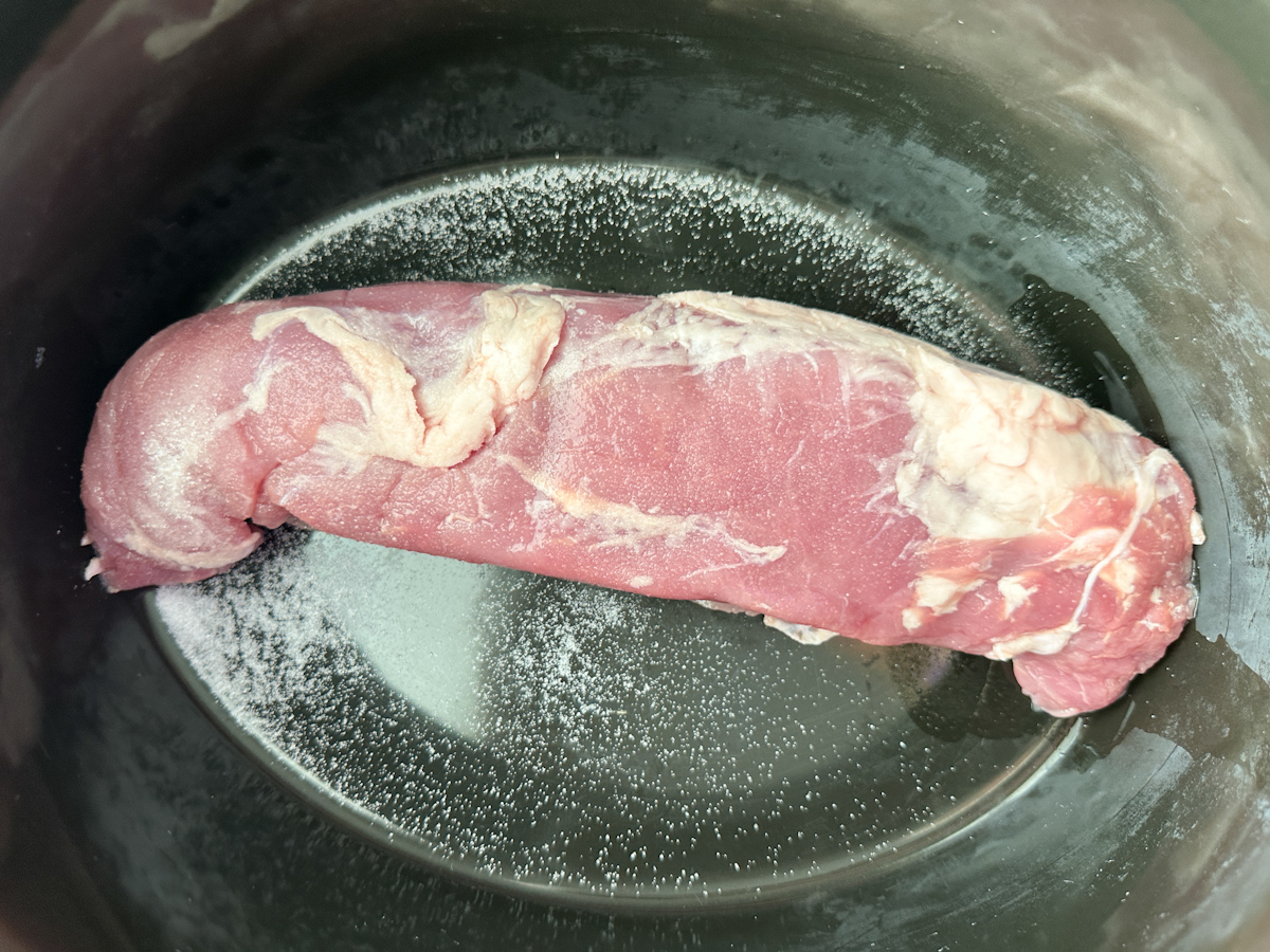 Step 3: Pat the pork loin dry with paper towels and season with salt. Place in slow cooker.