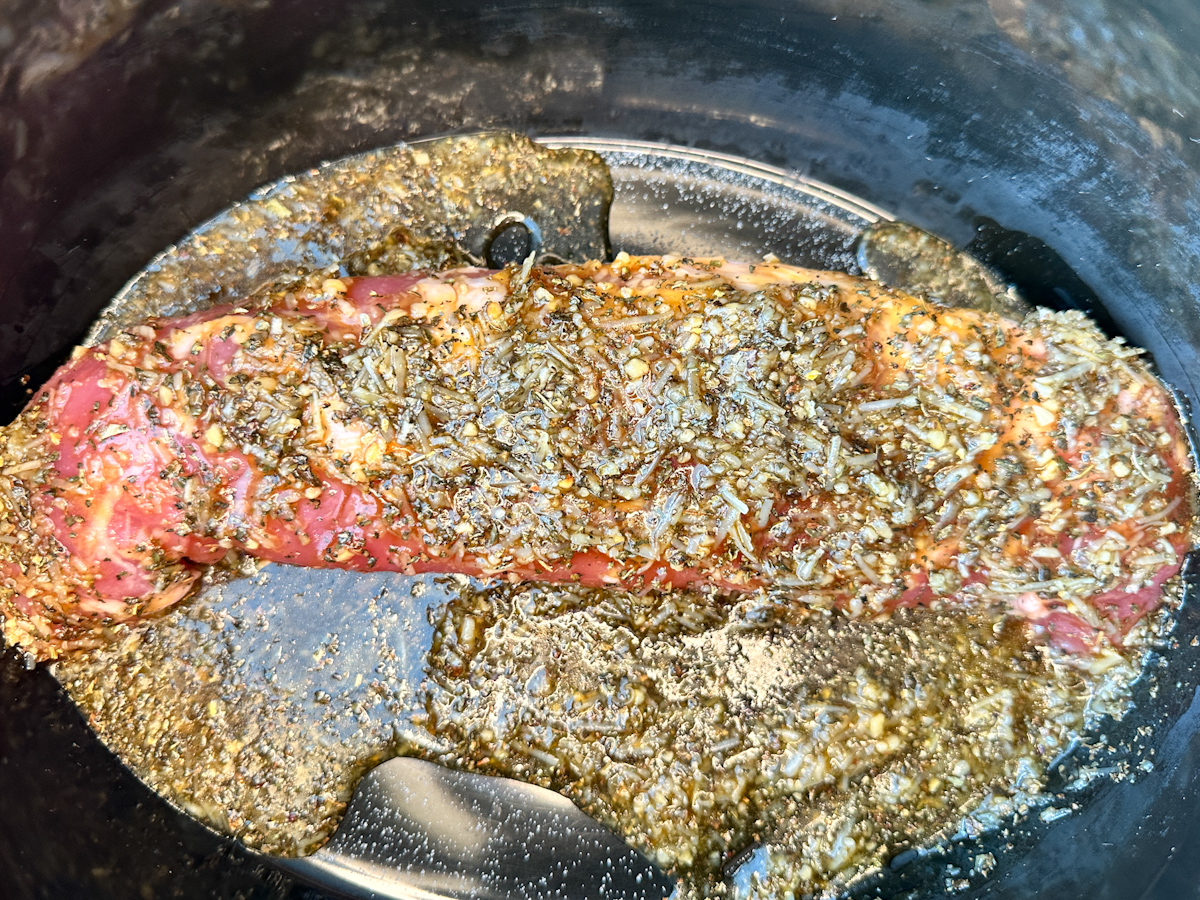 • Place the pork loin in the bottom of your slow cooker. Pour the Parmesan mixture evenly over the top, using a spoon or spatula to coat all sides.