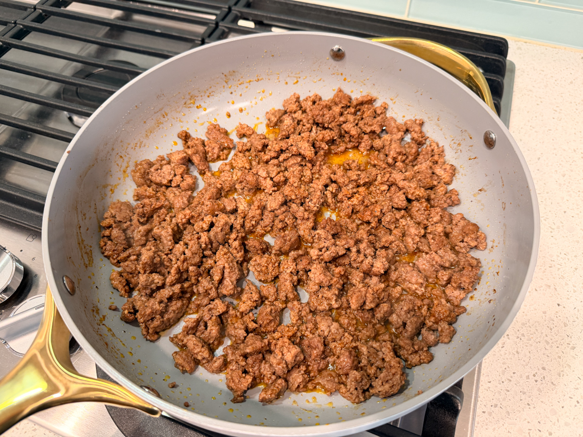- Place ground beef in the pan and season it with garlic powder, onion powder, paprika, salt, and pepper. Break up with a spoon and cook until browned.
