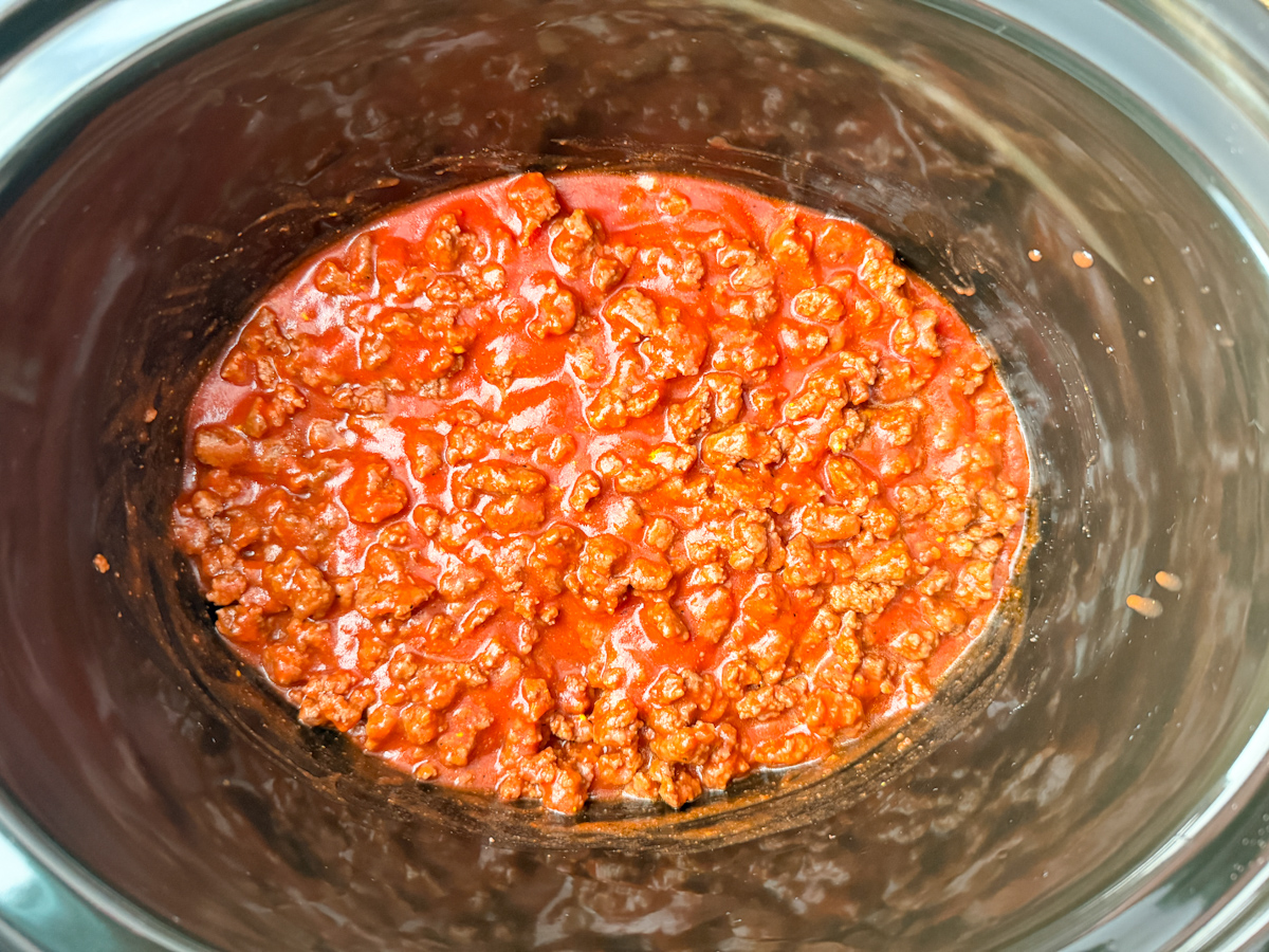 - Transfer the cooked meat to the slow cooker along with the sauce mixture. Stir well and cover with lid.
