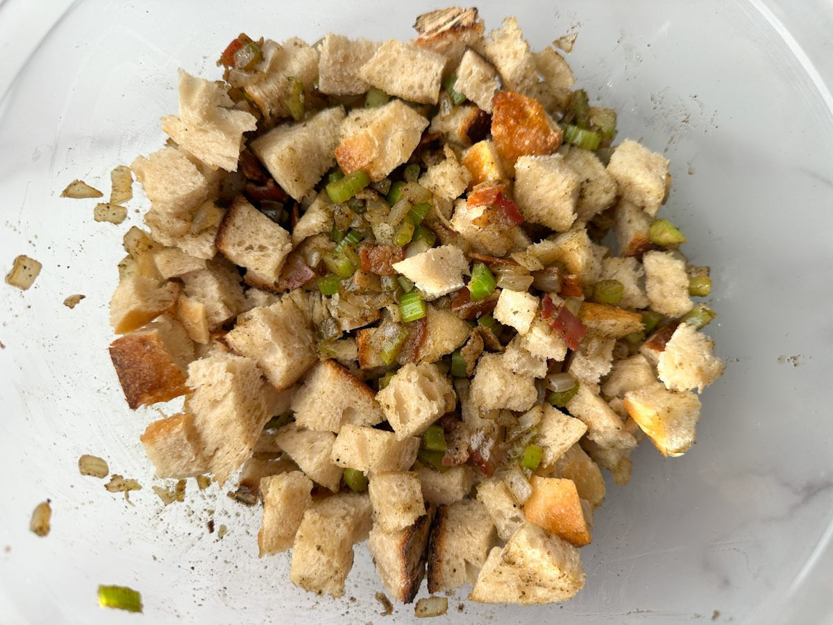 Step 5: In a large bowl, add the toasted bread cubes and the sautéed vegetable mixture. Pour the broth and egg mixture over the top and toss gently.