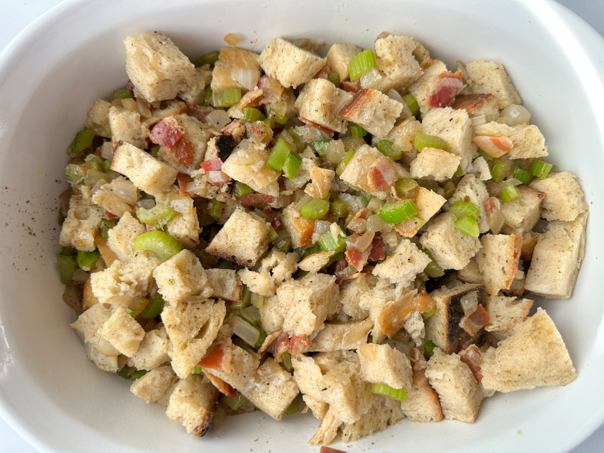 - While the bread bakes, heat a large skillet over medium heat. Add the bacon and cook until crisp, about 5 minutes. Stir in the butter, then add the onion, celery, sage, poultry seasoning, salt, and pepper. Sauté over medium-low heat until the vegetables are soft and fragrant, about 5-10 minutes. Remove from heat and let cool slightly.