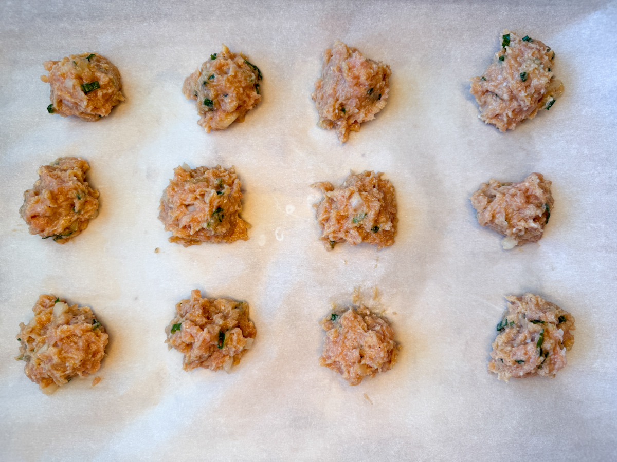Step 1: Preheat oven to 400 degrees F. In a large bowl, mix the meatball ingredients. Prepare 2 baking sheets with parchment paper and set aside.