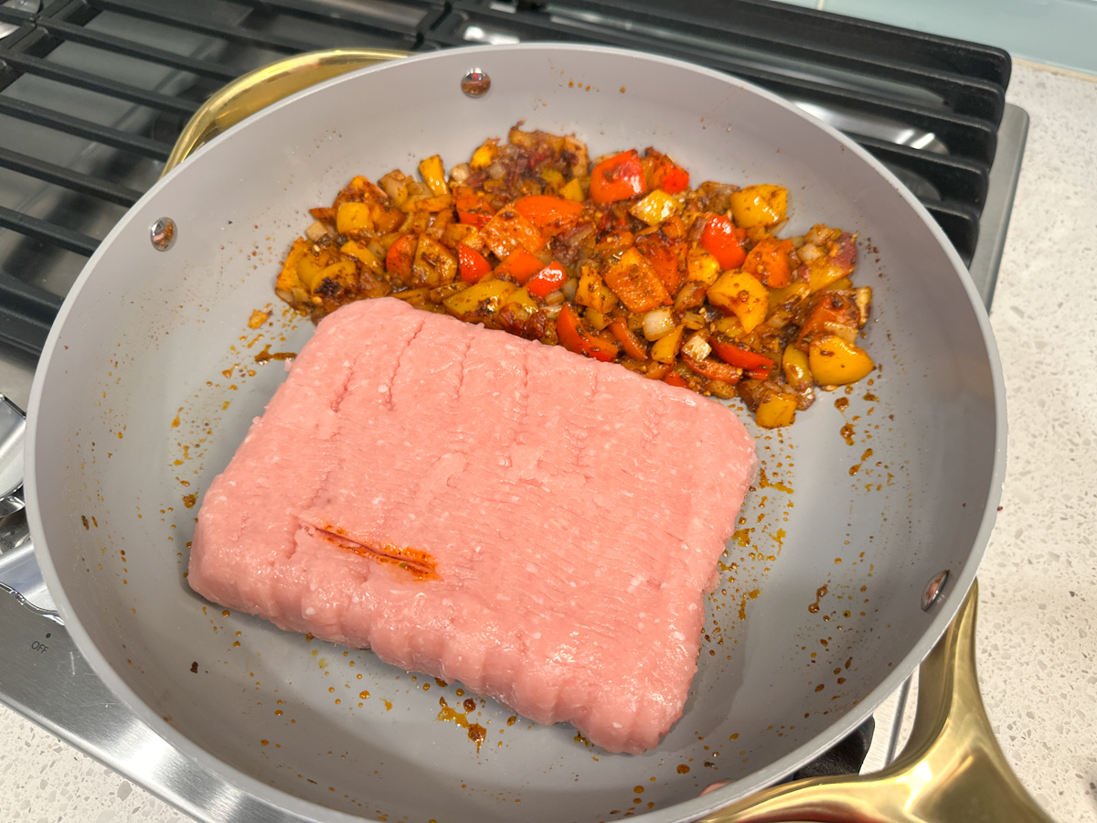 - Move veggies to the sides of the pan. Drizzle remaining 1 tablespoon olive oil in the center of the pan and add ground turkey. Let cook without stirring, until golden brown on bottom, about 1-2 minutes and then break up into chunks. Continue to cook and crumble the ground turkey until browned, incorporating veggies as you cook through the ground turkey, about 5 more minutes.