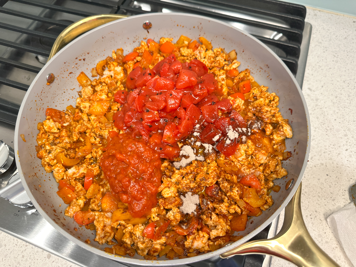 Step 4: Add in the fire-roasted diced tomatoes and beef bouillon. Stir to incorporate and cook off most of the liquid from the tomatoes. Add in the marinara sauce and stir to heat through.