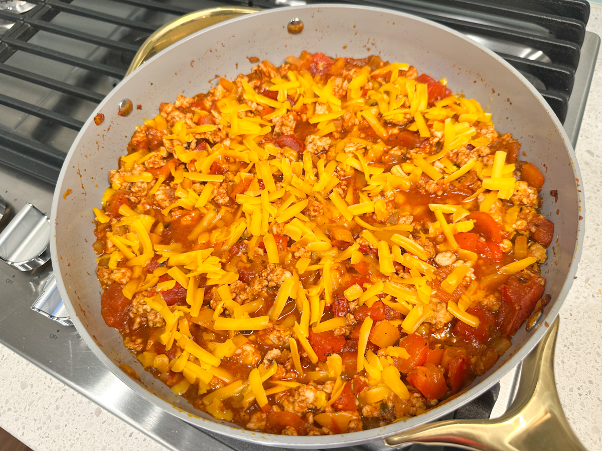 - Sprinkle with Cheddar cheese and immediately transfer the skillet to the oven. Bake for 4-8 minutes or until cheese is melted. Top with sliced green onions.