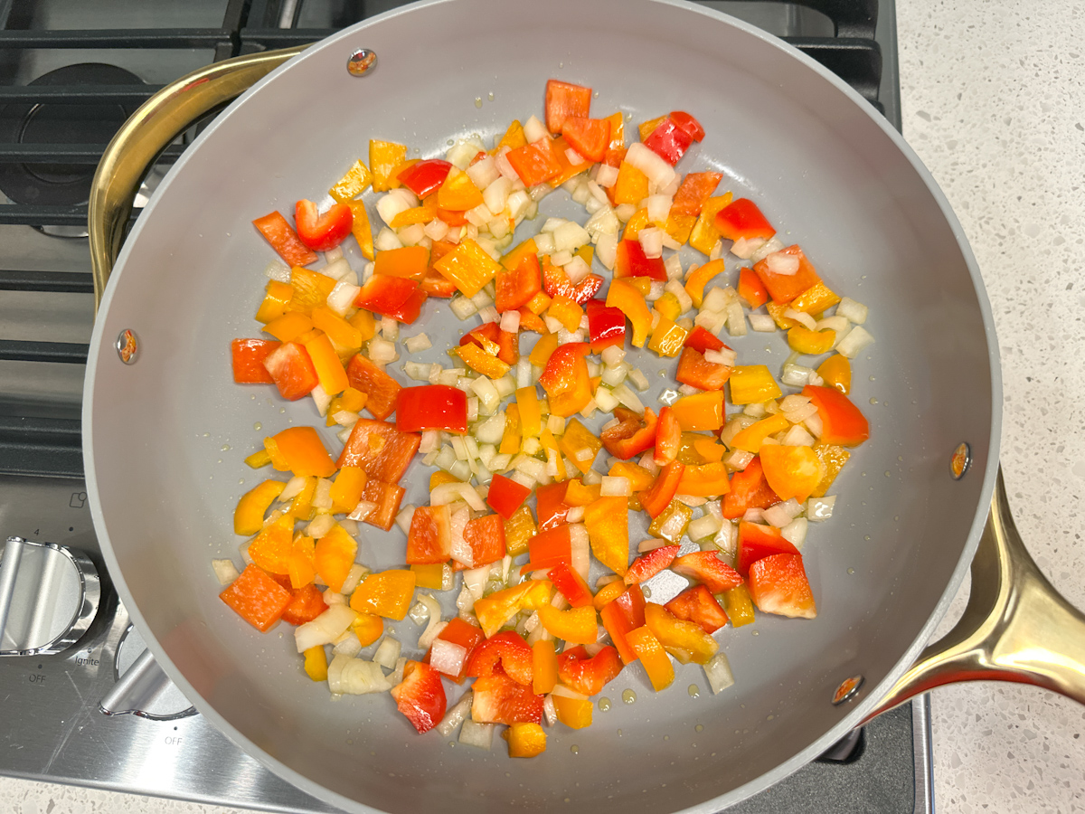 - Preheat the oven to 350 degrees F. Heat 1 tablespoon olive oil in a large skillet over medium-high heat. Once hot, add in the finely diced onions, and chopped bell peppers. Saute for 6-8 minutes or until softened. Add in garlic and stir for 30 seconds.